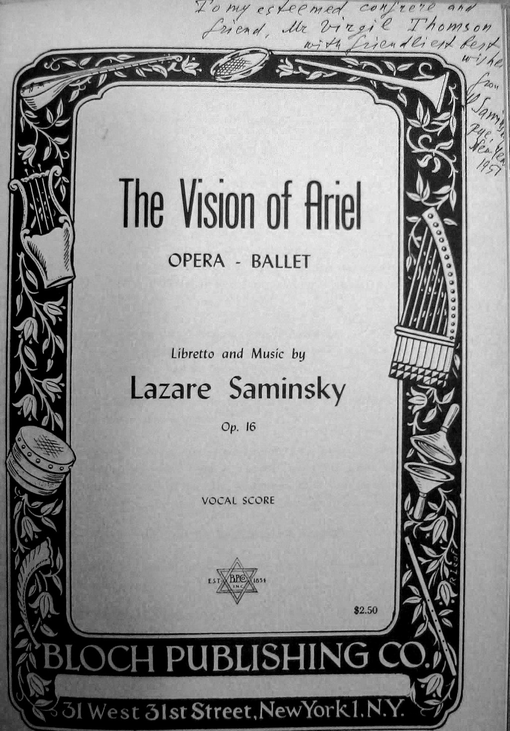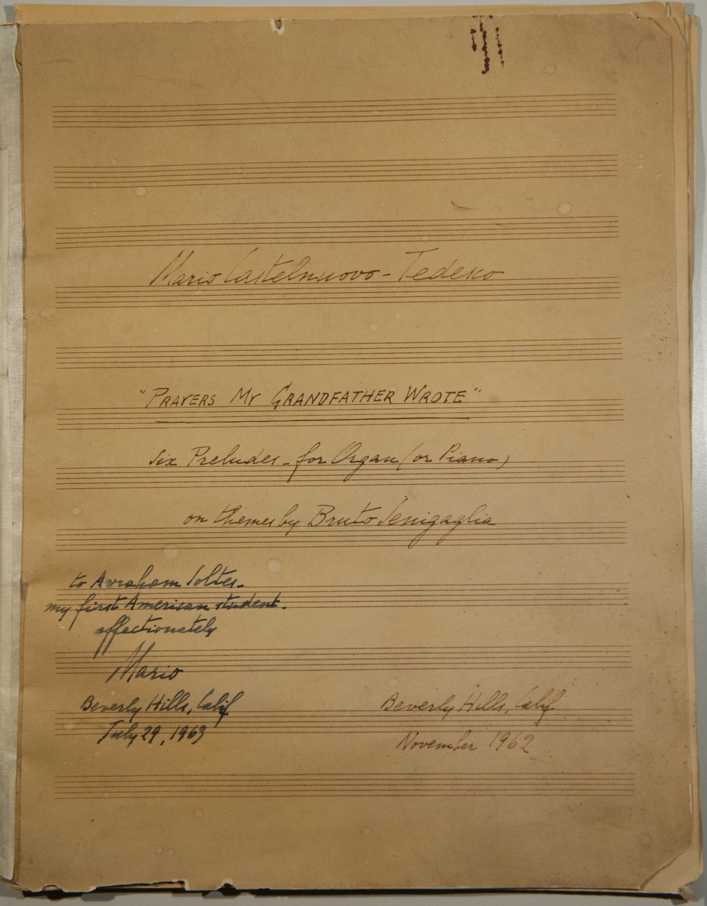 My maternal Grandfather, BRUTO SENIĢAĢLIA, was the man responsible for my musical career. He was the one who convinced my Mother (against my Father's wishes) to teach me Piano, when I was 9 years old. But he passed away a few months later, and he couldn't witness my progress. It was many years later, in 1925, (when also my uncles had passed away) that my Mother inherited my Grandfather's library. And there, on a shelf, hidden behind some big volumes, we found a little book where my Grandfather had written down some Hebrew prayers that he had set to music for three-part Chorus. It was a surprise to all of us: we knew that Grandfather was a music lover, but we never knew that he had written any music. To me, this discovery was one of the deepest impressions of my life, as I realized "where I came from," both artistically and spiritually. It so marked a sort of "starting point" in my production, as I wrote, in that same year the first of my "Jewihs works," The Dances of King David, based on traditional themes, which I dedicated to my Grandfather's memory. Now the little book is exactly one hundred years old: the first entry ( a simple "tone-row," marked as a "figured Bass") is dated 1862. And (a Grandfather myself . .) I have taken some of Grandfather's simple themes, developing them into a series of short Preludes, for Organ (or Piano) Mario Castelnuovo-Tedesco Beverly Hills, Calif. November 1962