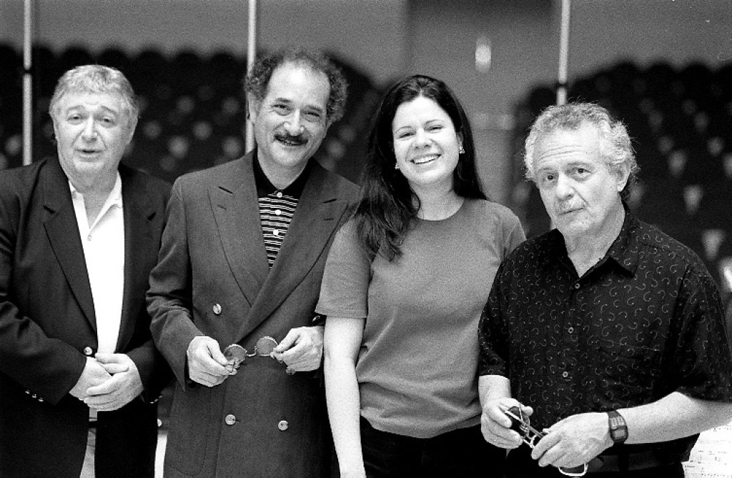 Conductor Gerard Schwarz, Milken Archive Artistic Director Neil Levin, clarinetist David Krakauer, and composer Henri Lazarof. Brandenberg Gate, Berlin, Germany.
