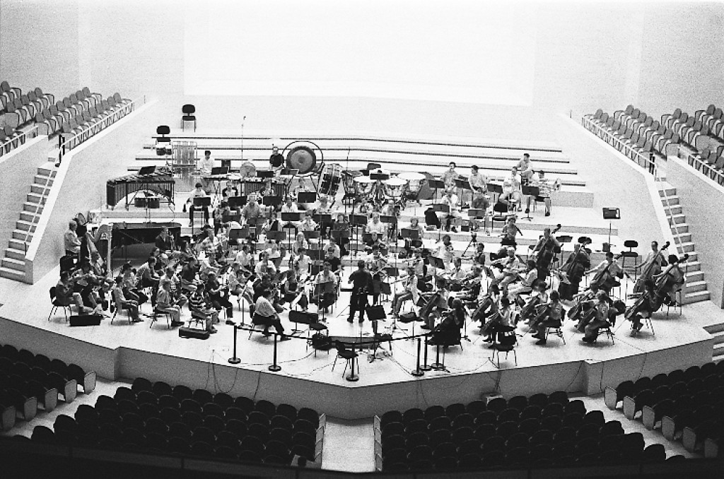 Conductor Jorge Mester and the Barcelona Symphony-National Orchestra of Catalonia. The Vision of Ariel recording session, Centre Cultural de Sant Cugat. Barcelona, Spain.