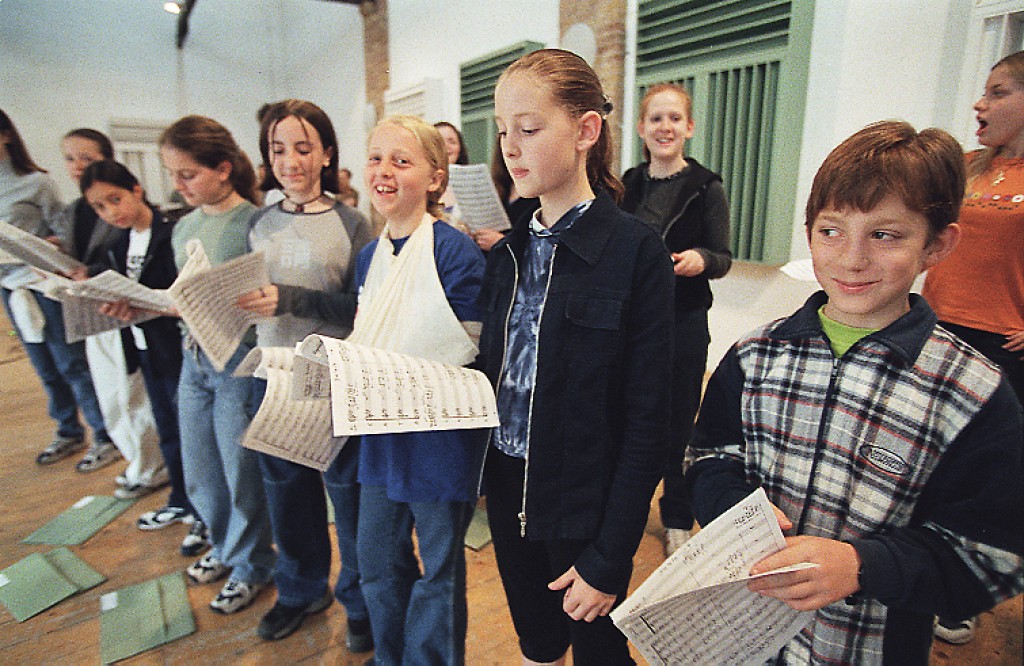 Conductor Nicholas Wilks and the Finchley Children's Music Group. Milken Archive recording session, The Warehouse. London, England.