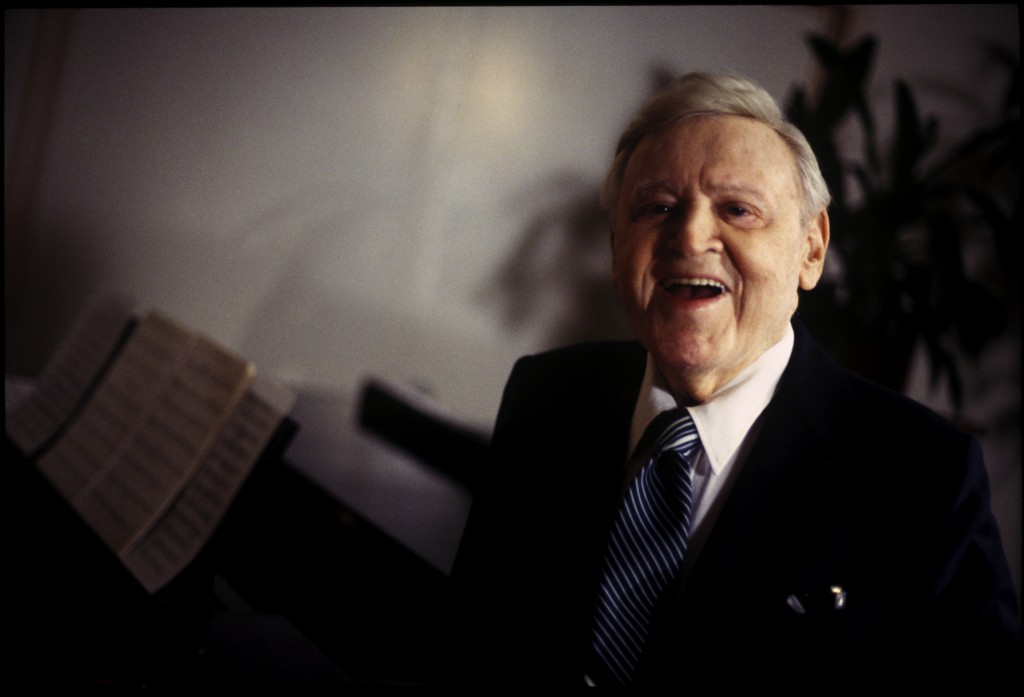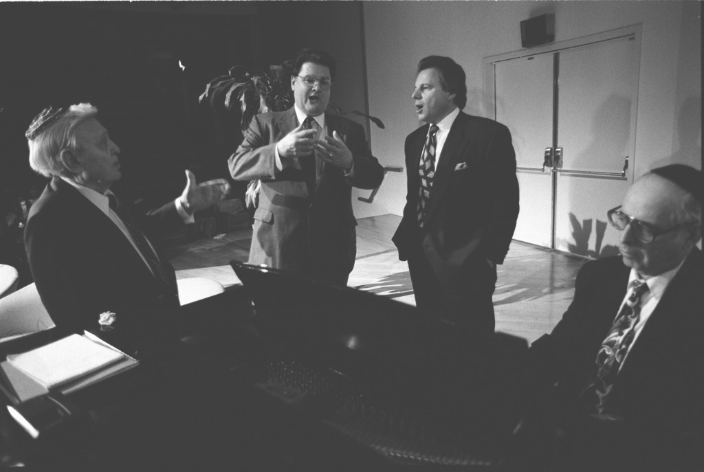 Cantor Moshe Ganchoff with former students cantors Jack Mendelson and Nathan Lam; seated at the piano is Danny Gildar, a cantor and renowned cantorial accompanist. Milken Archive oral history session. Jewish Theological Seminary. New York, New York.