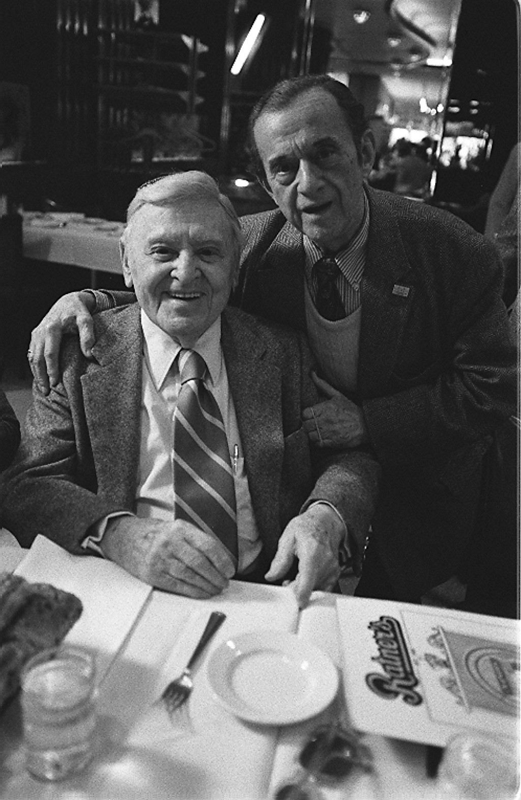 Cantor Moshe Ganchoff and Yiddish theater and radio star Seymour Rechtzeit. Ratner's Deli, New York, New York. Both were mainstays at the WEVD radio station in New York.