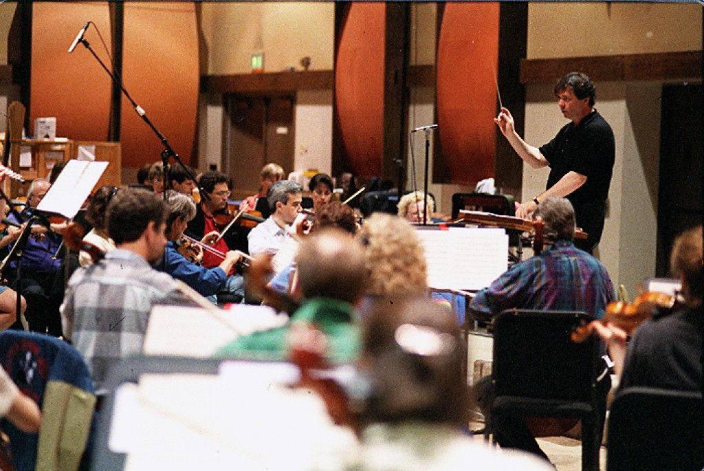 Gerard Schwarz conducts the Seattle Symphony orchestra. Klezmer Rondos recording session, Benaroya Hall. Seattle, Washington.