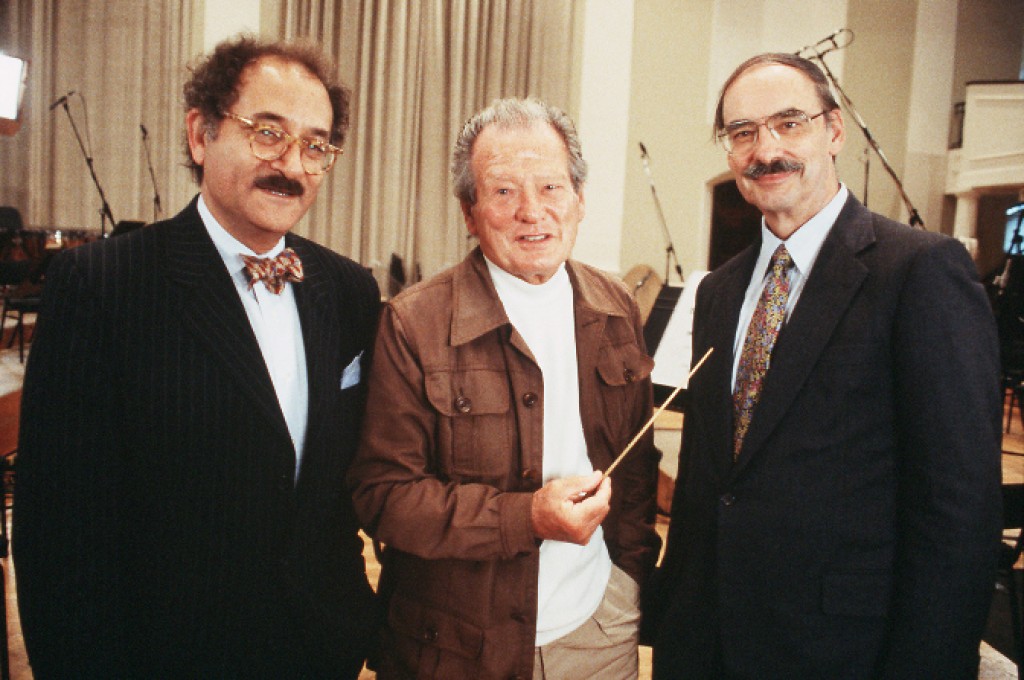 Milken Archive artistic director Neil W. Levin, with Sir Neville Marriner and composer Thomas Beveridge. Yizkor Requiem recording session, Henry Wood Hall. London, UK.