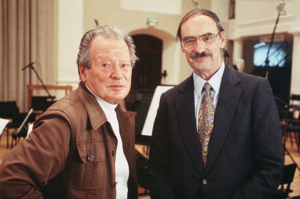 Sir Neville Marriner and composer Thomas Beveridge. Yizkor Requiem recording session, Henry Wood Hall. London, UK.