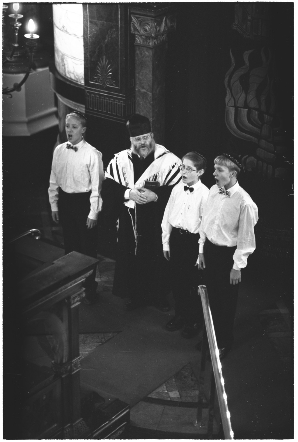 Cantor Benzion Miller with young choristers. Milken Archive recording session, New West End Synagogue. London, England.
