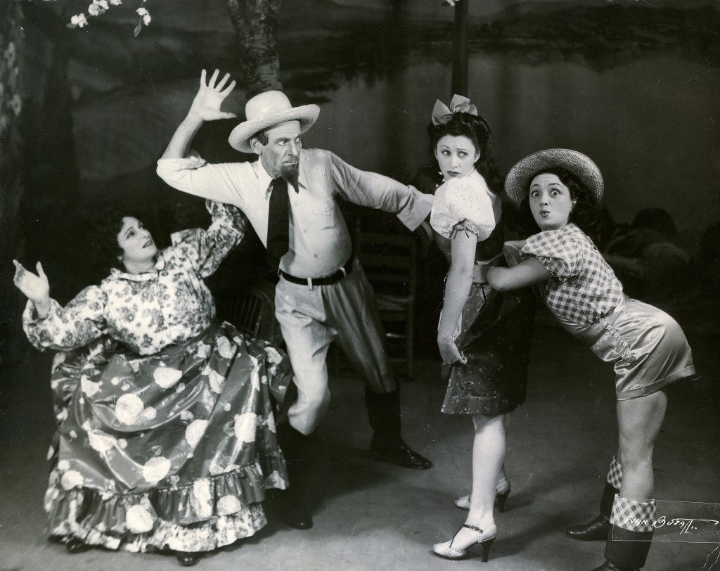Molly Picon (far right) with Esta Salzman (center right) on stage in Jacob Kalich's Oy, iz dus a leben (Oh, What a Life!).